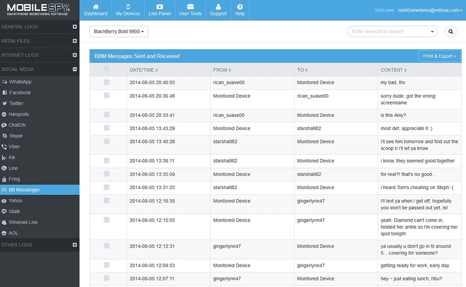 Taking monitoring to a whole new level of coverage, our software logs BlackBerry, Yahoo, Gtalk, Windows Live, and AOL messenger apps, widening the net to ensure that you have the best chance of capturing any communications your child or employee has on his mobile phone.
