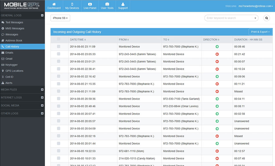 This powerful system gives you the ability to monitor activities online in real time. Your logs are safely stored in your secure Mobile Spy account which is accessible from any web browser using your username and password.