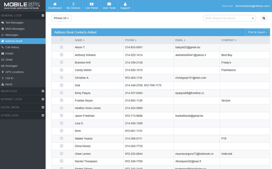 You need to know who your child is contacting in order to protect them. Mobile Spy logs all contacts that are saved on the mobile phone.