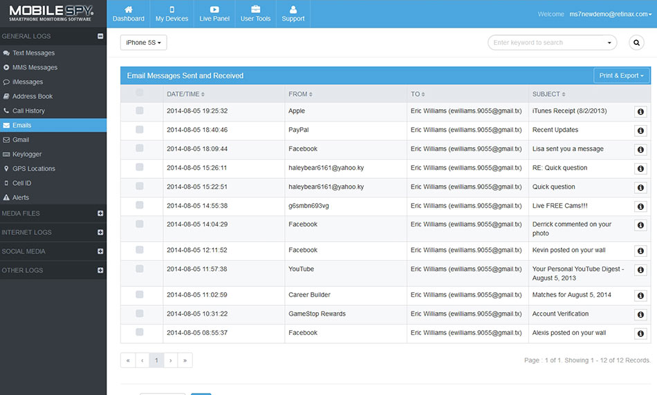 Your child can use the cell phone email app to set up accounts at social media websites. Maybe you don't want your child to set up an account that you don't know about. Mobile Spy helps parents learn about what emails their children are sending and receiving.