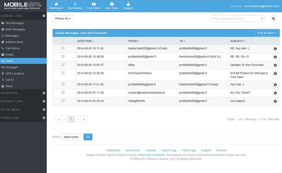 Login to the online control panel to view time/date stamp, to/from addresses, subject and full text of all Gmails sent and received on the iPhone or rooted Android smartphone.