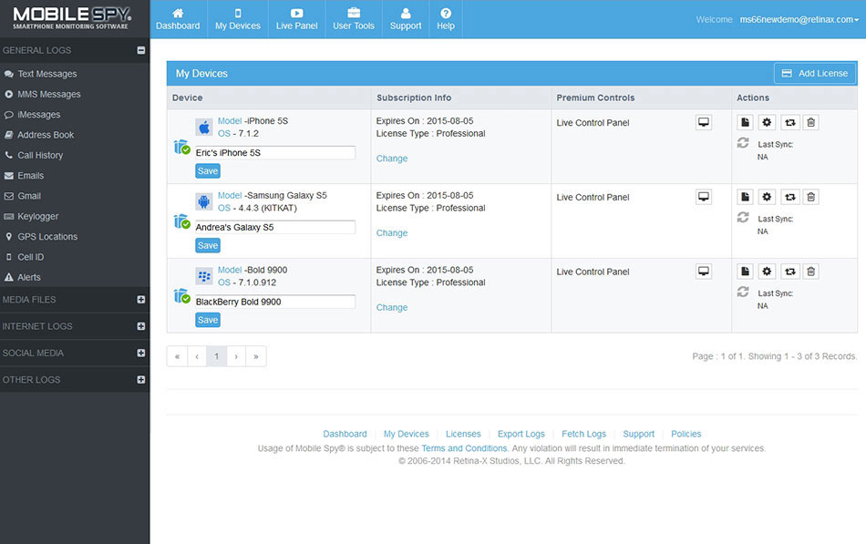 Mobile Spy makes it easy for you to monitor more than one child or employee. Add as many licenses as you need to a single account.