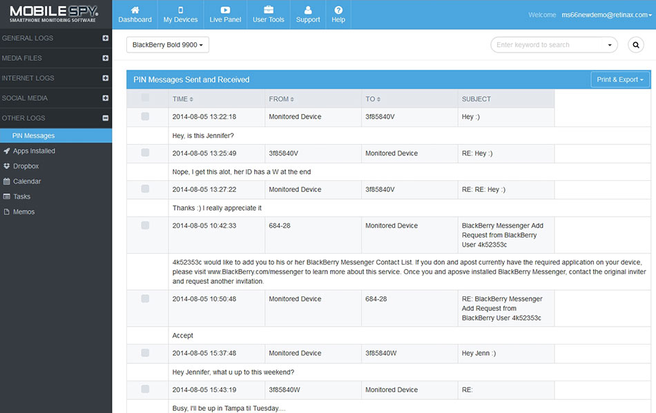 If you are monitoring a BlackBerry device you will want to know about their BlackBerry PIN Message activities. Often used because of its chat-like features with other BlackBerry smartphones, the PIN is one area not to miss in your smartphone monitoring plan.