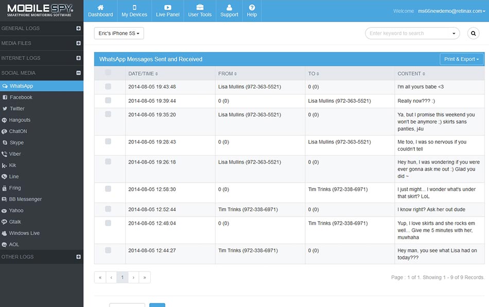 Other mobile monitoring software will only give you URLs visited on the default browser and text messages from the app that came with the phone. Mobile Spy has extra features that monitor social media messenger apps such as Facebook, Twitter and WhatsApp. Now you get a better picture of all the communication channels your children or employees use on their mobile phones.